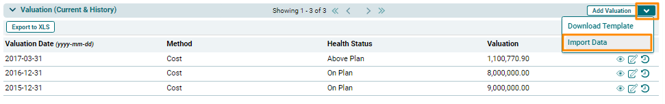 3. To import bulk valuation for instruments, click on the down arrow button next to Add Valuation button. Click on Import Data.