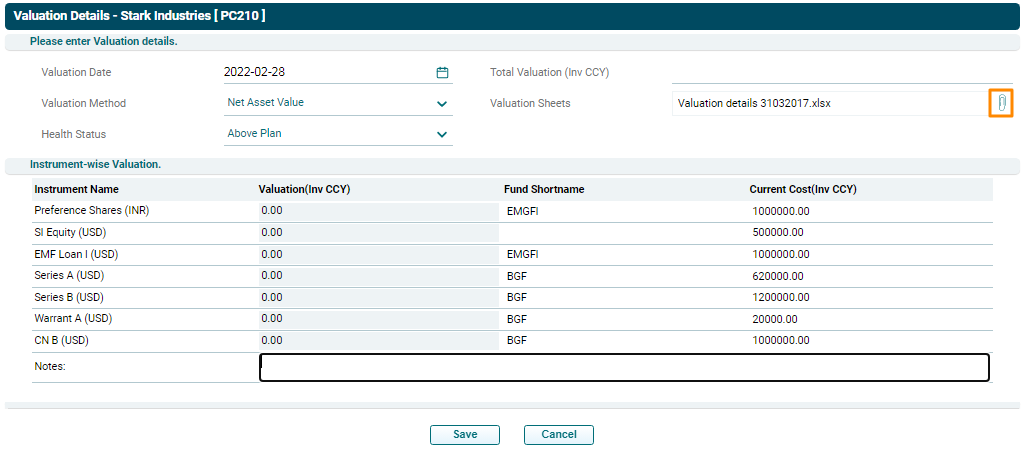 - Valuation Sheets: Displays the excel file containing valuation details. Click on the pin (