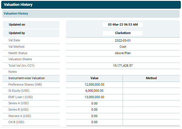 ) icon in the Action column. The Valuation History window is displayed. You can view when were the changes made and by whom.
