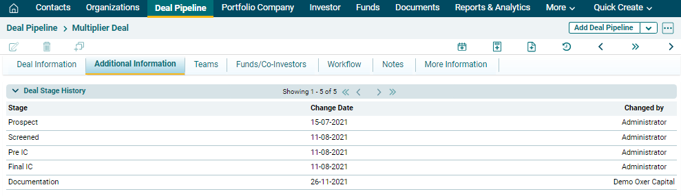 External Team and Deal Stage History. Funds