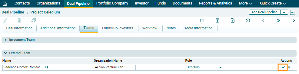 Investment Team panel captures details of internal team members associated with the deal. The details included are: