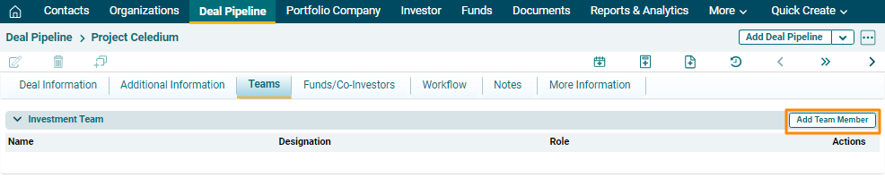 - Role: Role of the member which includes Deal Originator, Deal Partner, Deal Team Member, and Others.