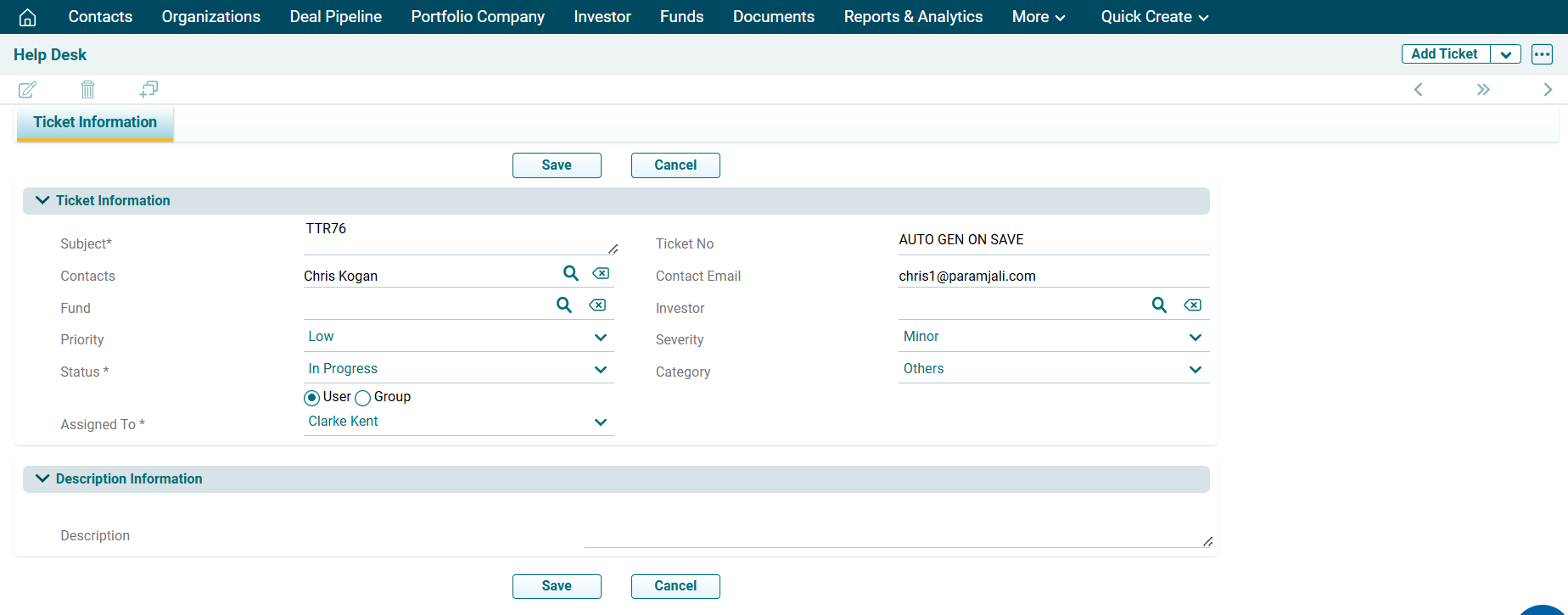 - Status: Specify the status of the ticket, i.e., Open, In Progress, or Closed.
