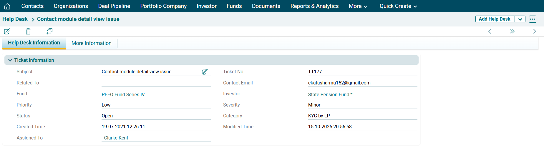 This panel allows you to capture the basic details of a ticket related to an investor.