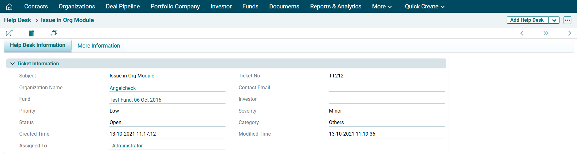 This panel allows you to capture the basic details of a ticket related to an organization.