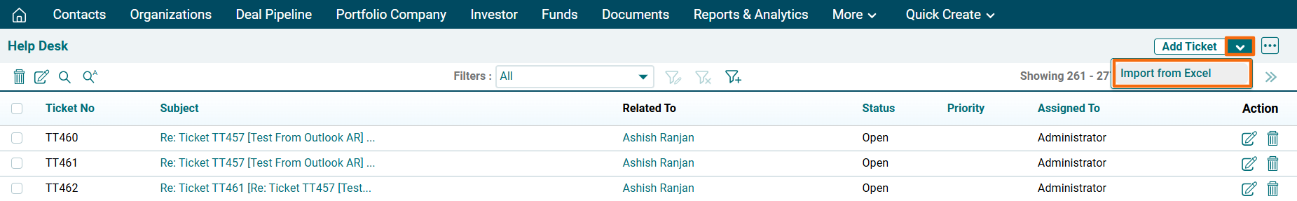 2. Click on the down arrow button next to Add Ticket button in the top right corner. Click on Import from Excel.