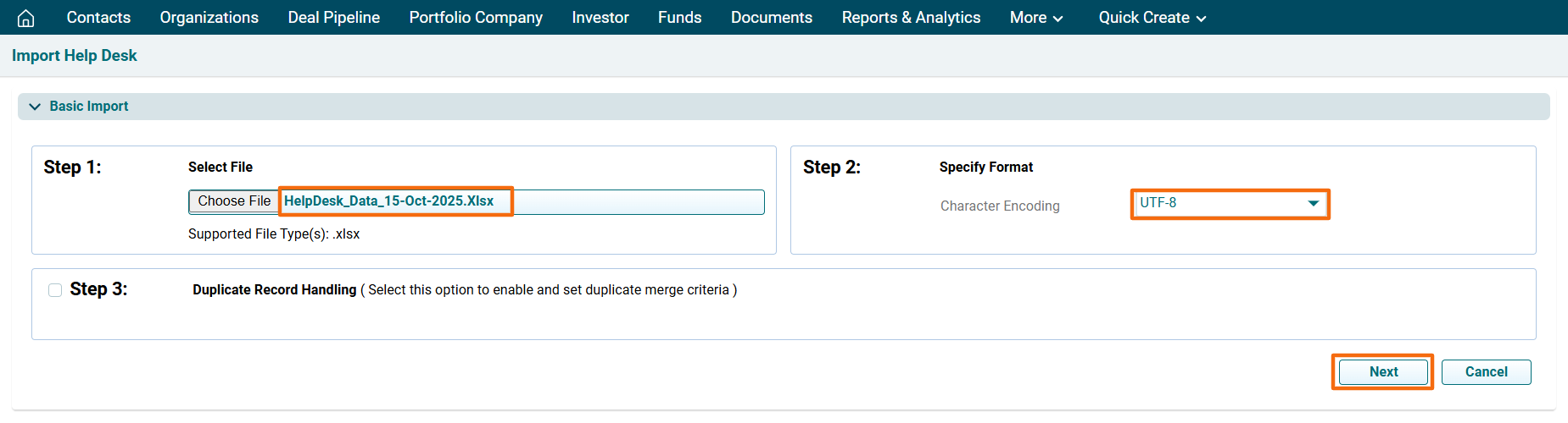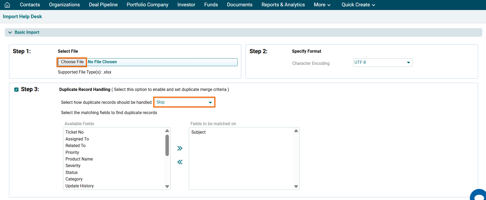 3. The Import Help Desk window is displayed. Click on Choose File button. In Step 3, you can specify whether to Skip, Overwrite, or Merge the duplicate records, if any.