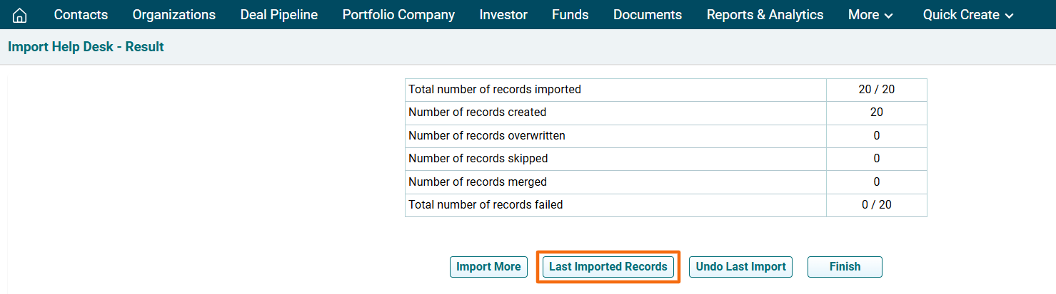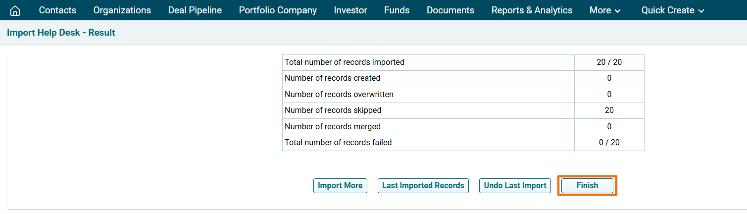 6. You will see different options here. You can Import More records, download Last imported Records, Undo Last Import, and Finish. To complete the Import, click Finish.