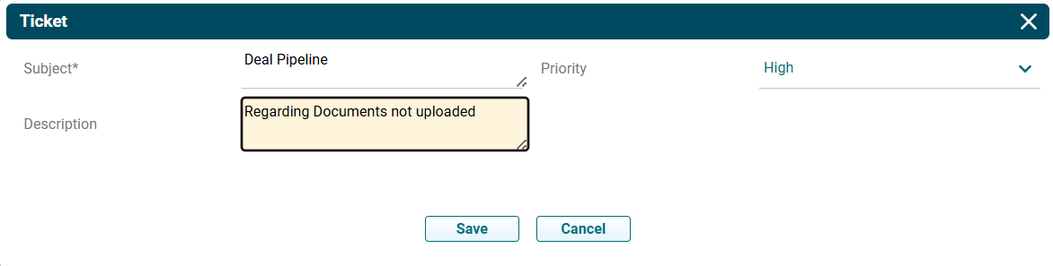 2. The Ticket pop-up will be displayed. Update all the mandatory details marked with an asterisk and click Save.