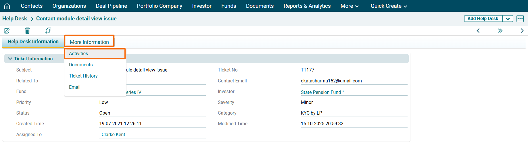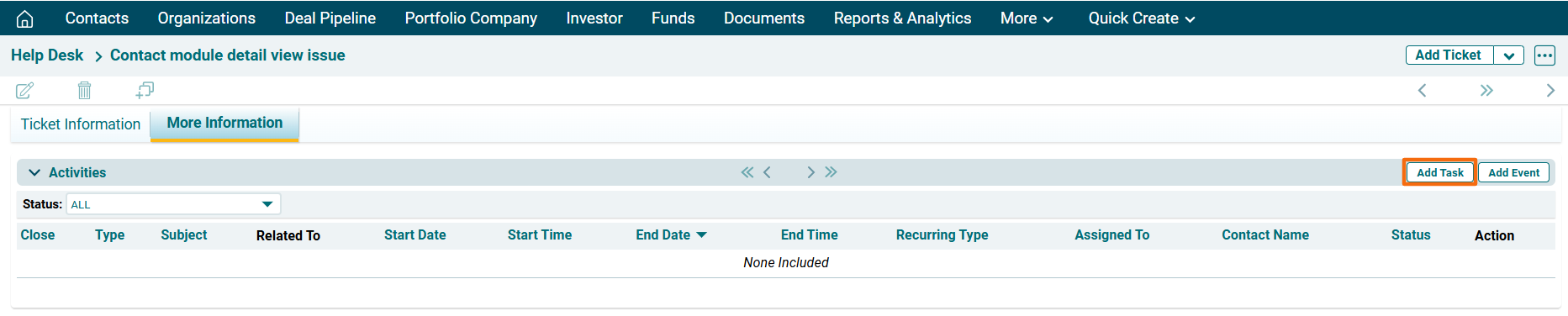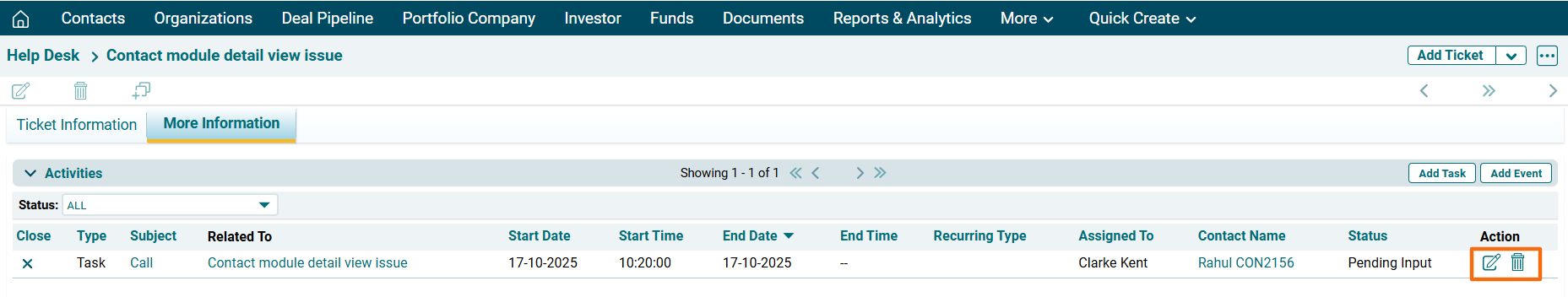 6. The Task will be listed in the Activities Panel under the More Information Tab. Click on the Edit or Delete icons to make changes.