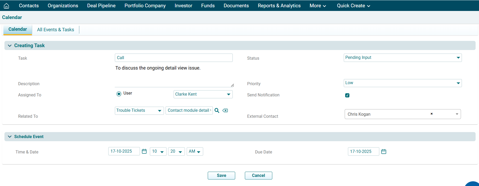 Create a Task and assign tasks to be completed to your internal team members by sending a reminder to their mailboxes.