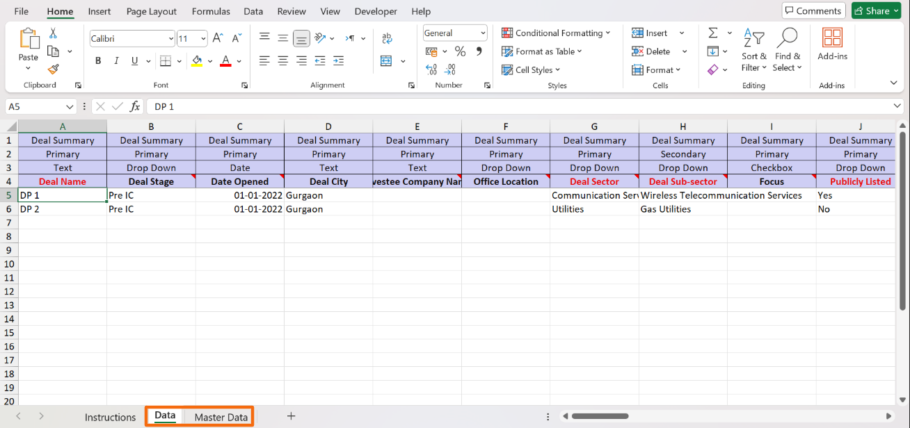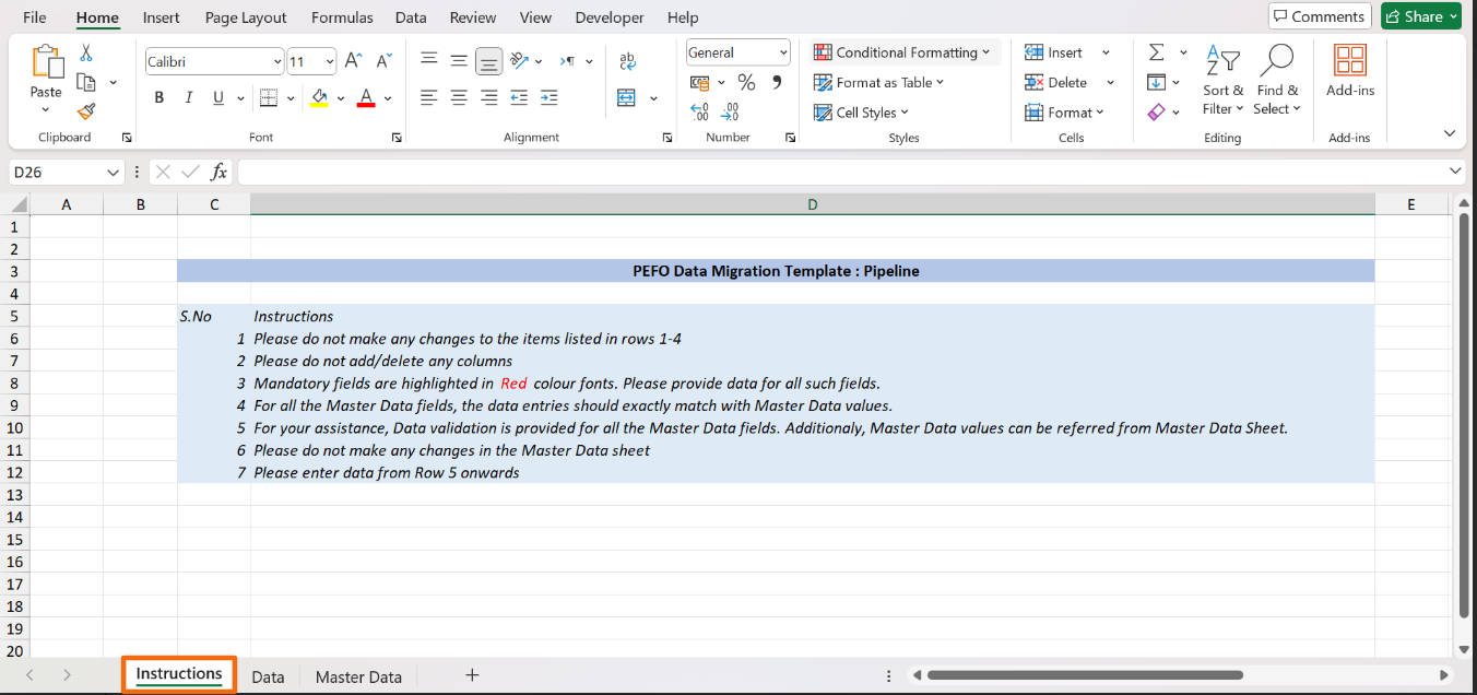 3. In the downloaded file, you can see three sheets- Instructions, Data, and Master Data. As the name suggests, the instructions sheet states all the related instructions.