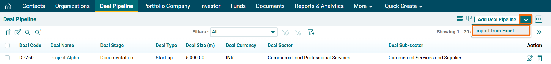 5. To import the file, click on the down arrow button beside Add Deal Pipeline button. Click on Import from Excel.