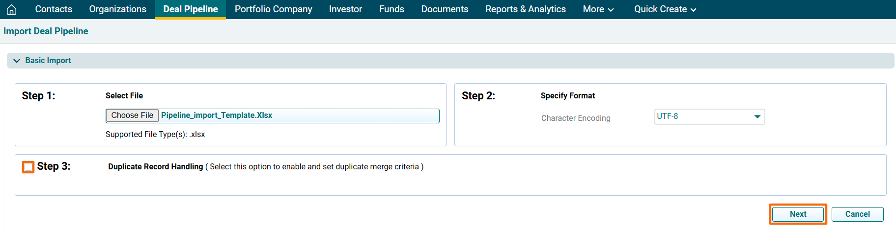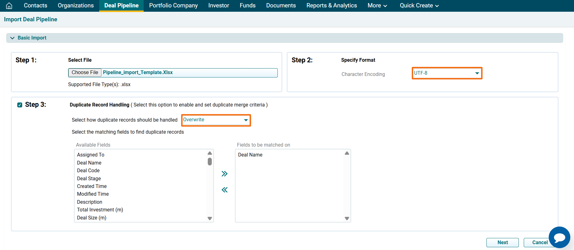 6. The Import Deal Pipeline window is displayed. Click Choose File.