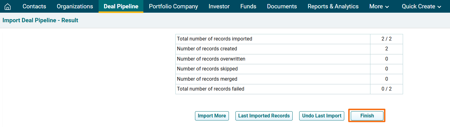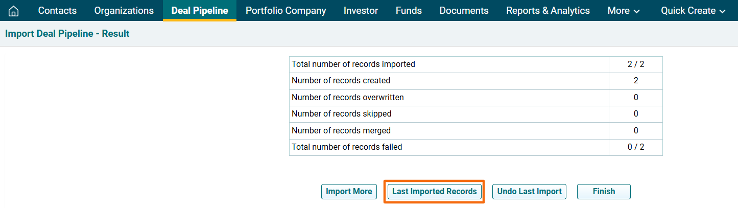 11. The Import Deal Pipeline- Result window is displayed. To view last imported records, click on Last Imported Records. The excel file will download. Check the file for the highlighted errors and fix them before importing again.