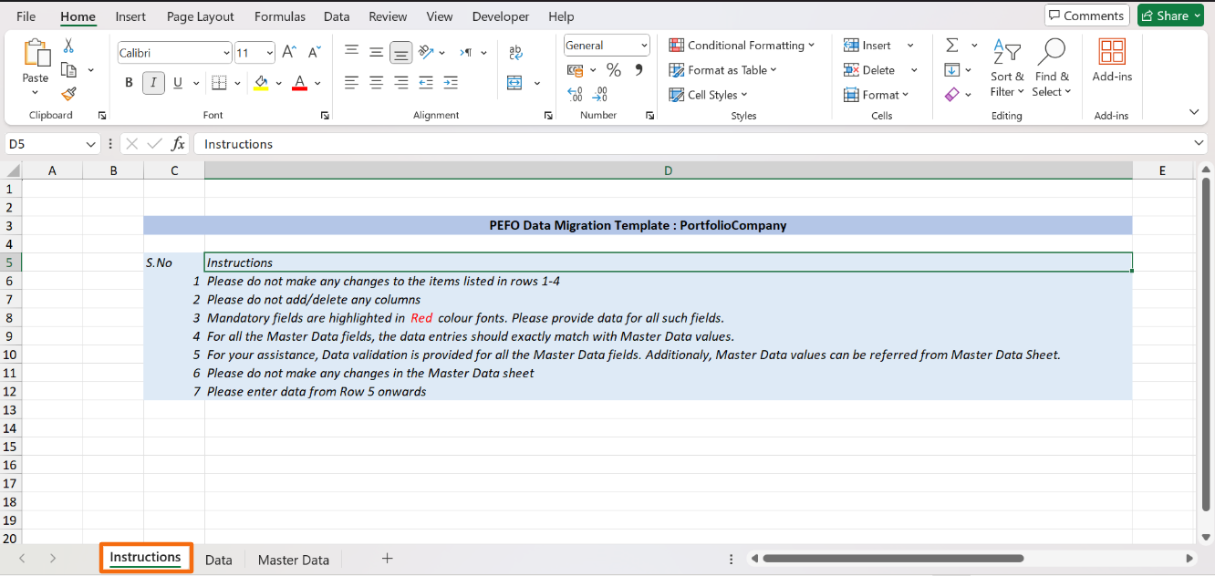 3. In the downloaded file, you can see multiple sheets- Instructions, Data, and Master Data. As the name suggests, the instructions sheet states all the related instructions.