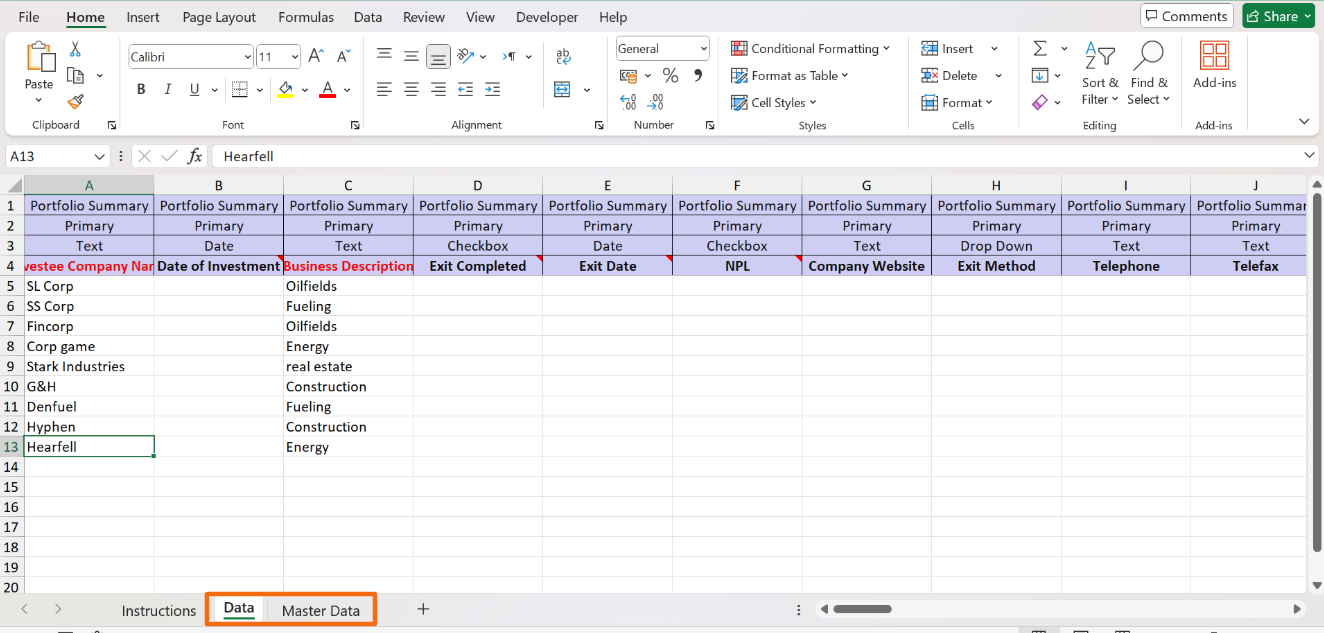 This template allows you to bulk upload historical portfolio company data to PEFO.