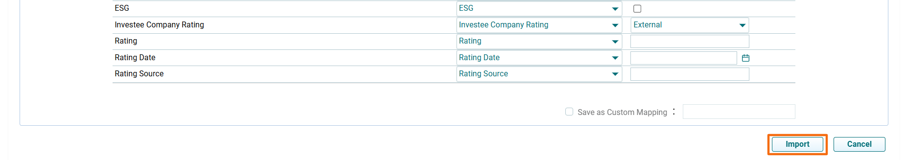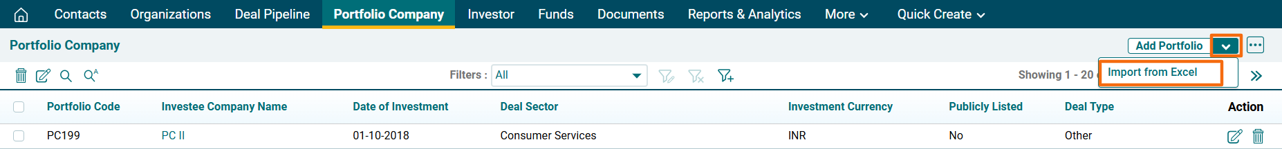 5. To import the file, click on the down arrow button beside Add Portfolio Company button. Click on Import from Excel.
