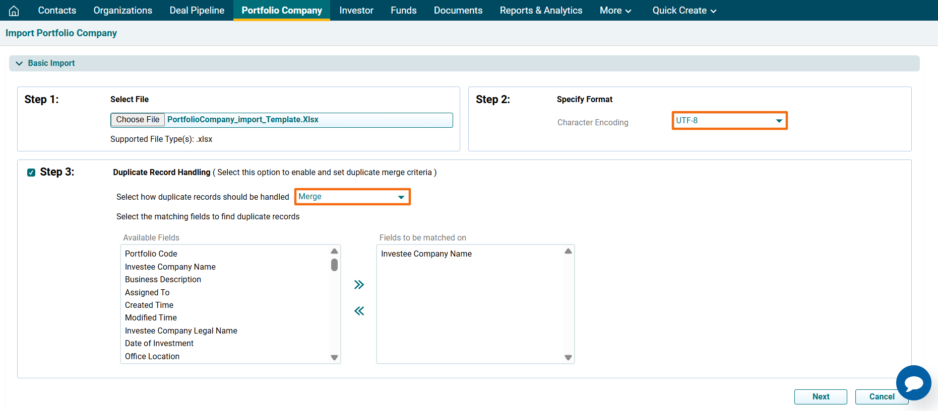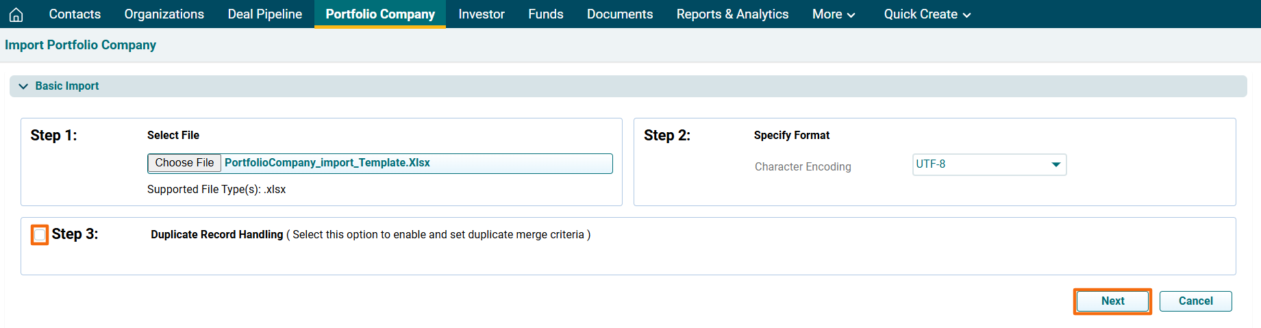 6. The Import Portfolio Company window is displayed. Click Choose File.