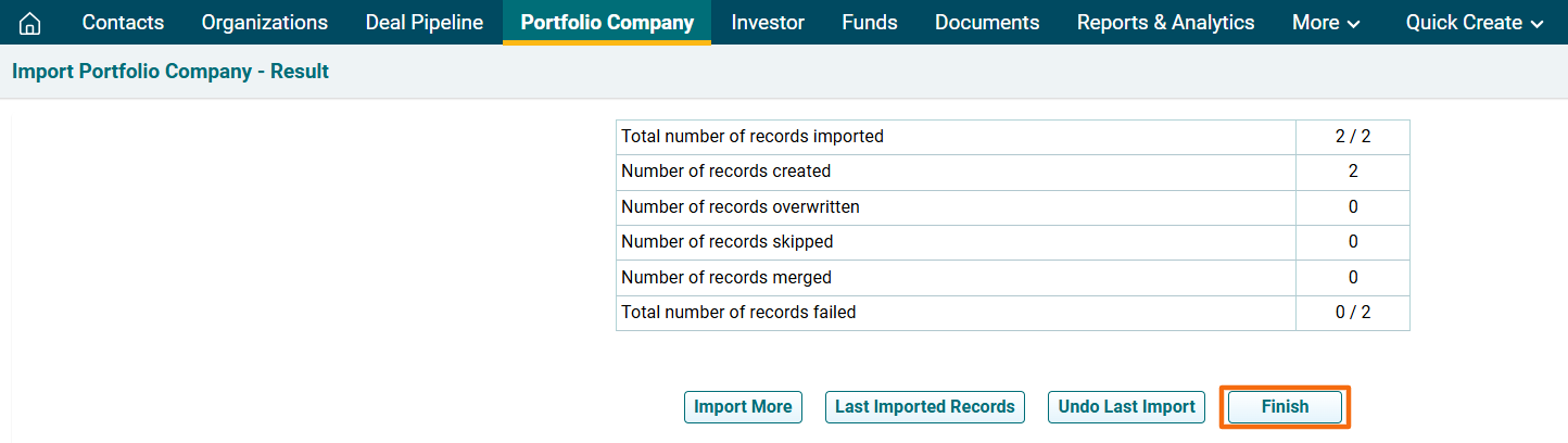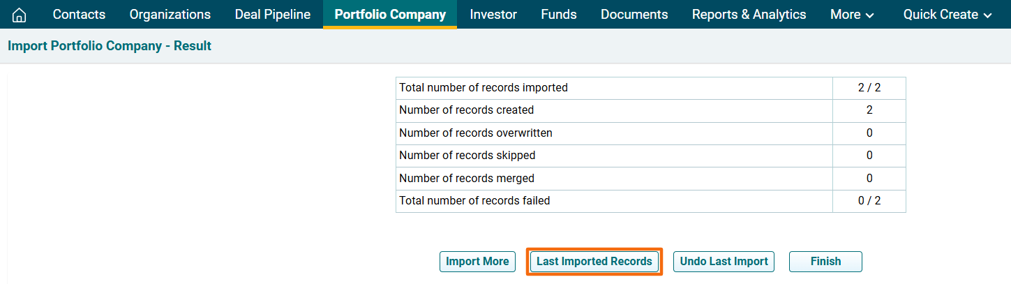 11. The Import Portfolio Company- Result window is displayed. To view last imported records, click on Last Imported Records. The excel file will download. Check the file for the highlighted errors and fix them before importing again.