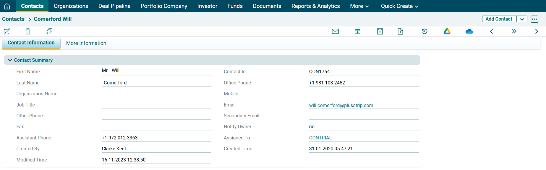 In PE Front Office, you can change the screen configuration of the contact information tab. You can add, hide, or rename the fields.