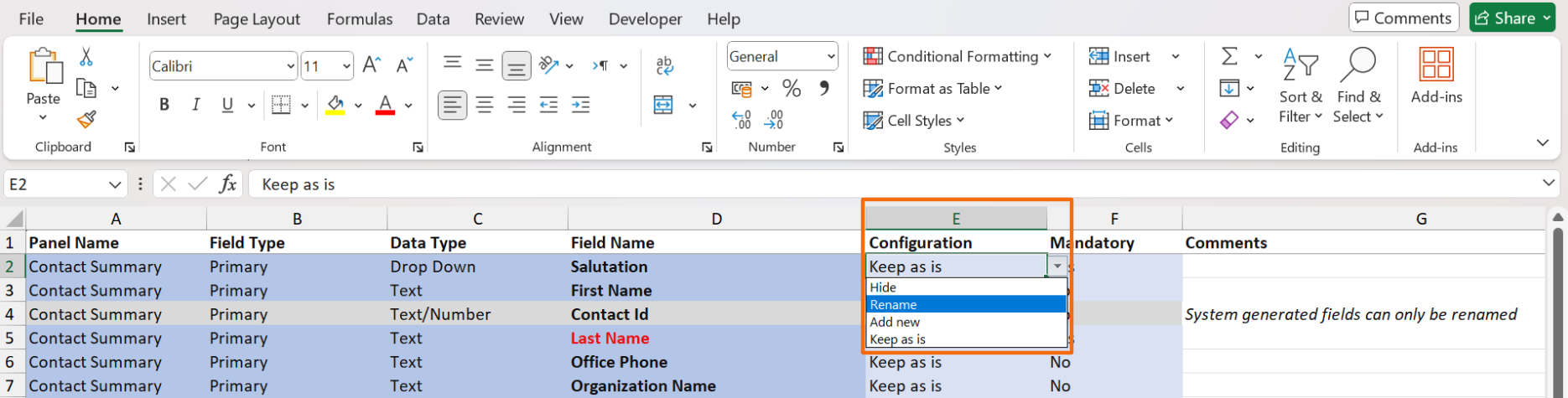 3. In the downloaded file, choose the desired option, i.e. Hide, Rename, Add New, or Keep as is from the dropdown list in column E.