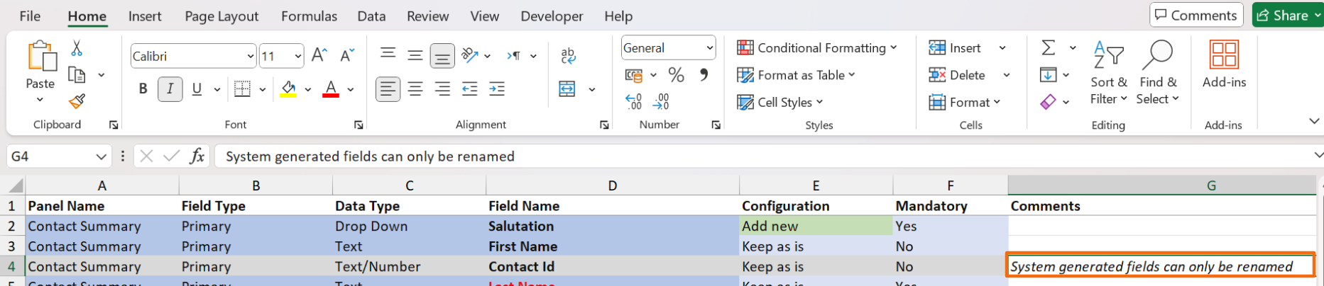 4. To make a field mandatory, go to column F. To mark it as mandatory, choose Yes from the dropdown list in column F. Else, choose No.
