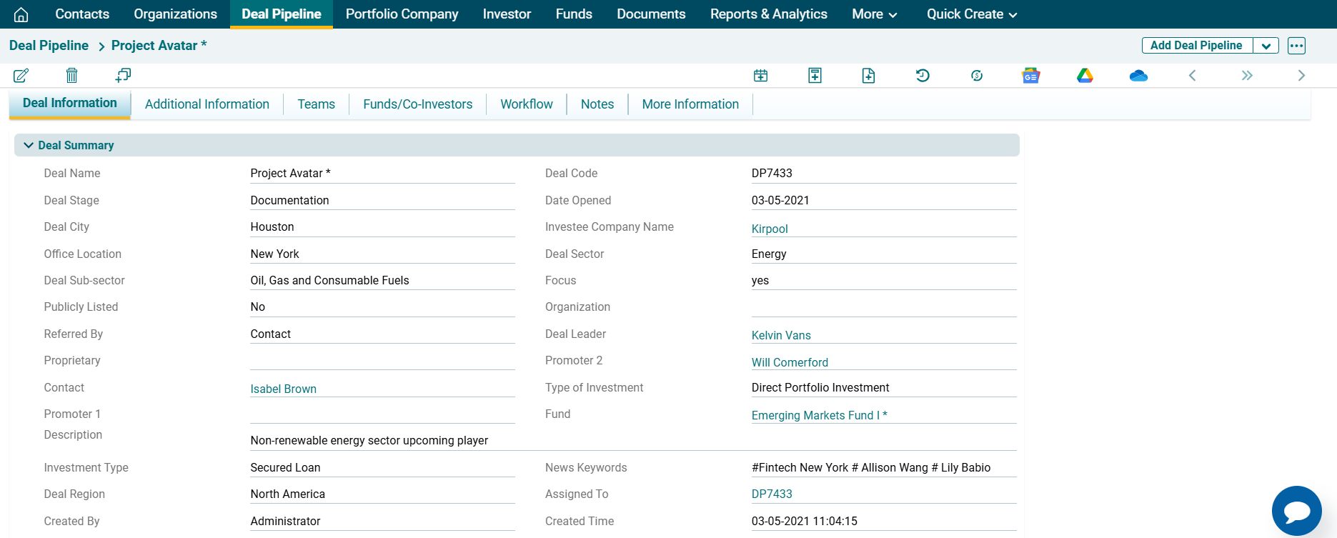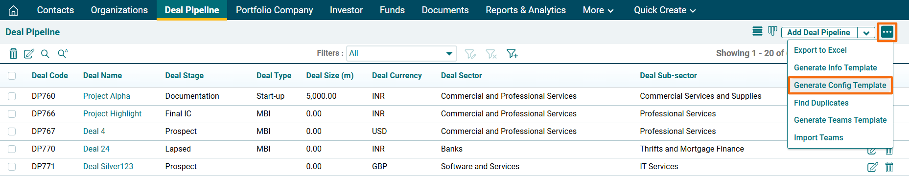 In PE Front Office, you can change the screen configuration of the Deal Pipeline information. You can add, hide, or rename the fields.