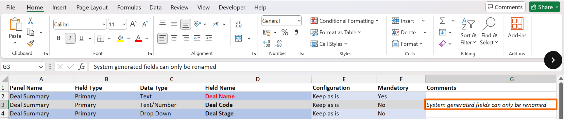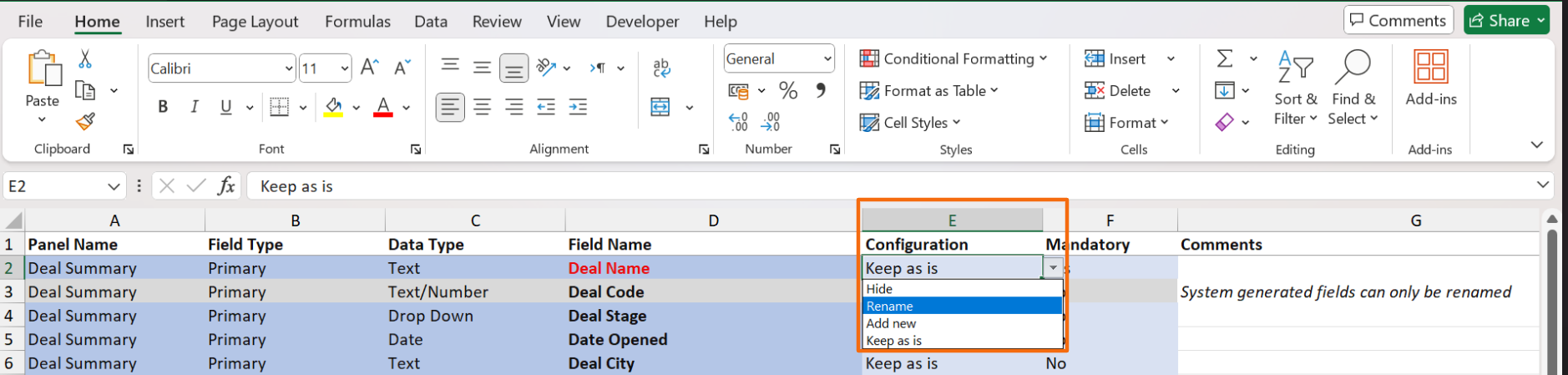 3. In the downloaded file, choose the desired option, i.e. Hide, Rename, Add New, or Keep as is from the dropdown list in column E. System generated fields can only be renamed.