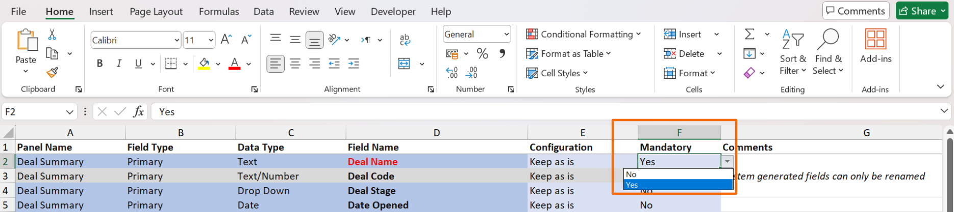 4. To make a field mandatory, go to column F. To mark it as mandatory, choose Yes from the dropdown list in column F. Else, choose No.