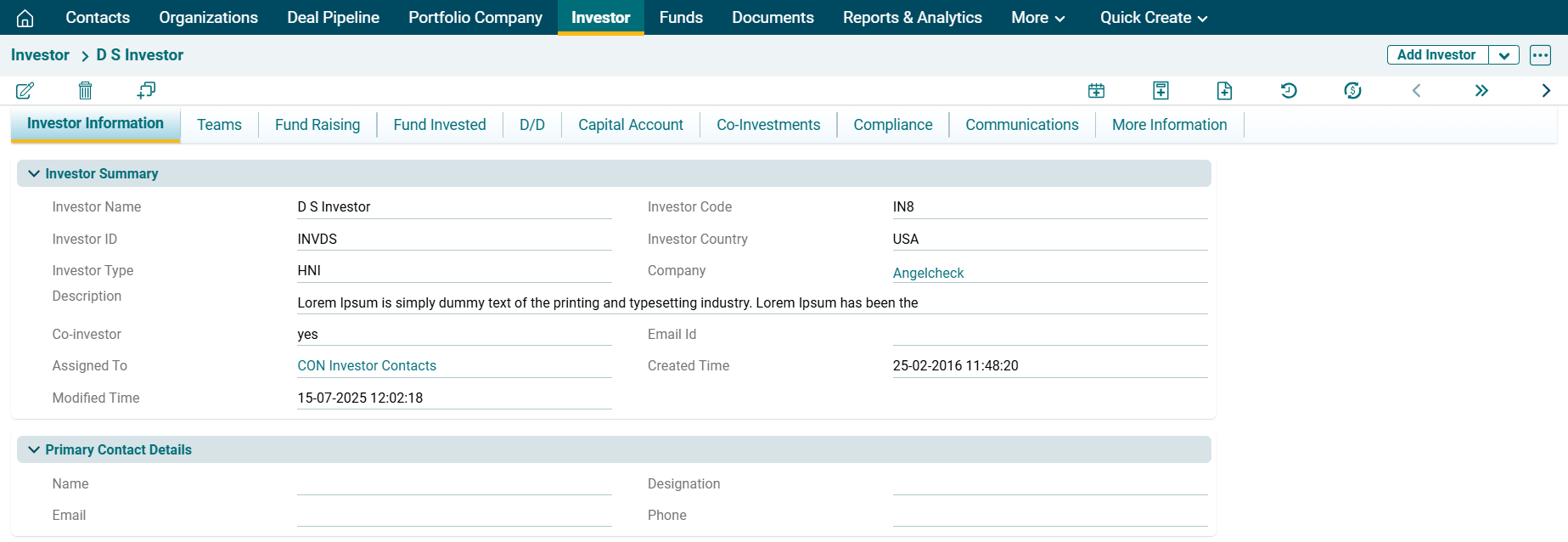 In PE Front Office, you can change the screen configuration of the Investor information. You can add, hide, or rename the fields.