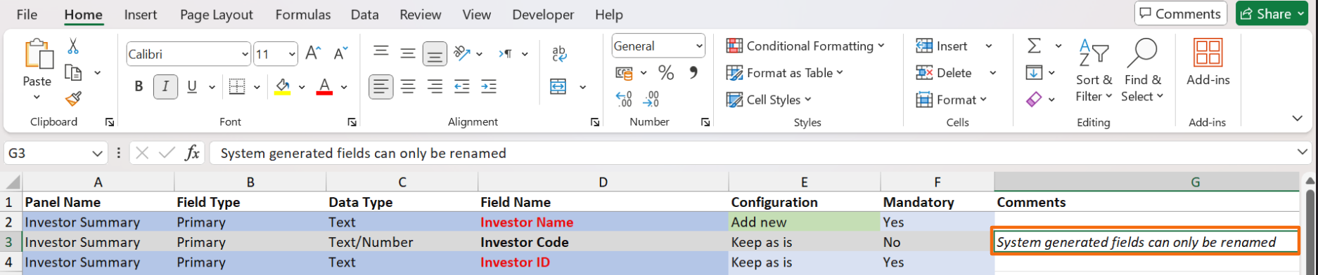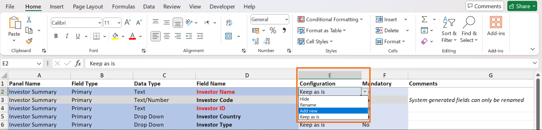 3. In the downloaded file, choose the desired option, i.e. Hide, Rename, Add New, or Keep as is from the dropdown list in column E. System generated fields can only be renamed.