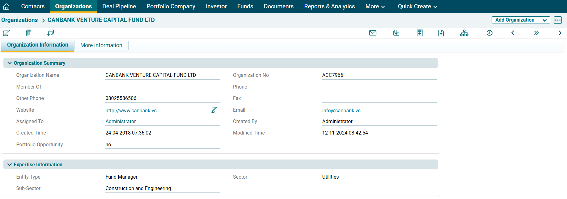 In PE Front Office, you can change the screen configuration of the organization information. You can add, hide, or rename the fields.