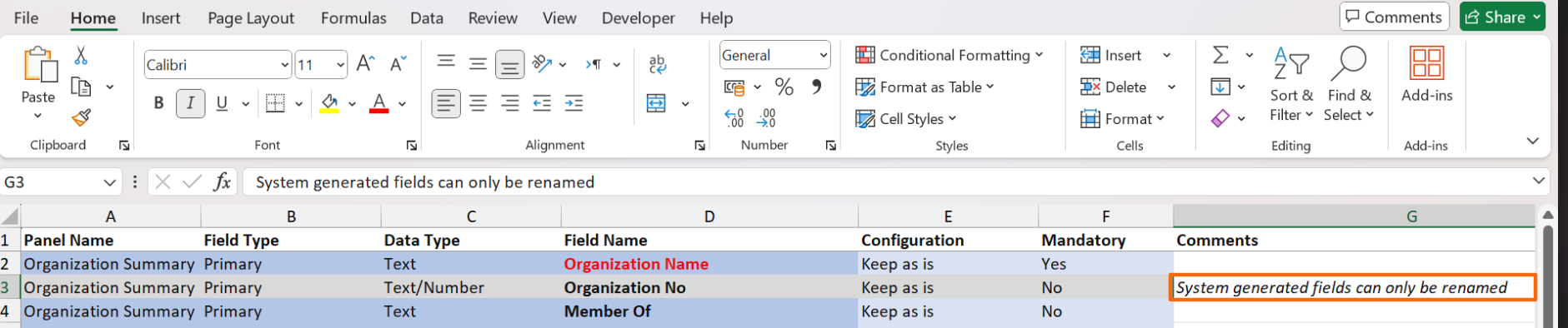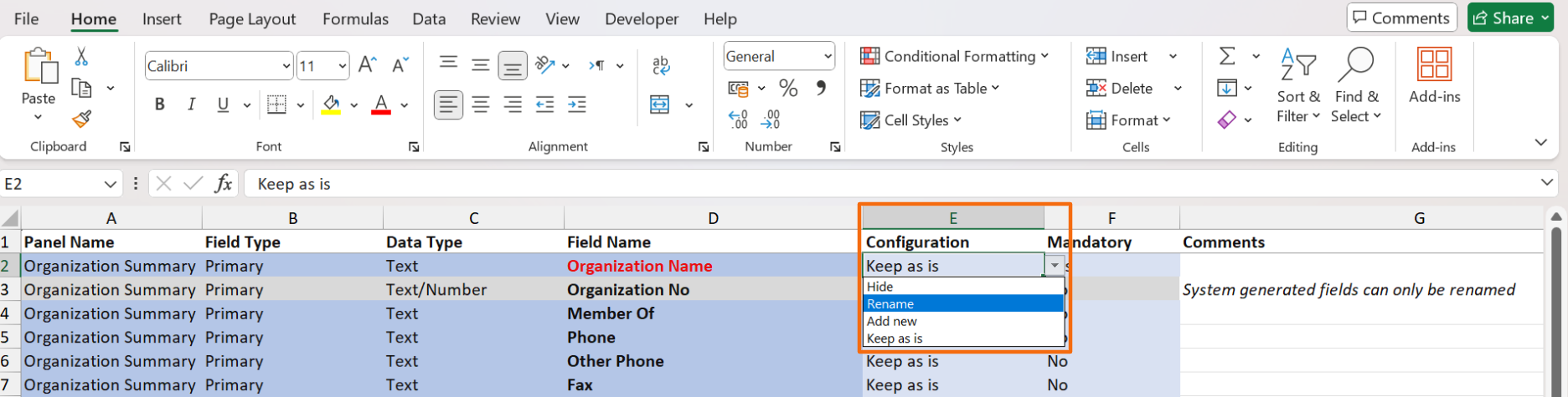 3. In the downloaded file, choose the desired option, i.e. Hide, Rename, Add New, or Keep as is from the dropdown list in column E. System generated fields can only be renamed.
