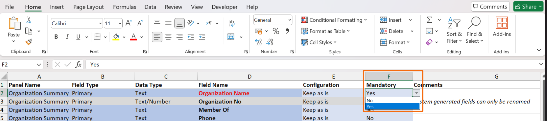 4. To make a field mandatory, go to column F. To mark it as mandatory, choose Yes from the dropdown list in column F. Else, choose No.