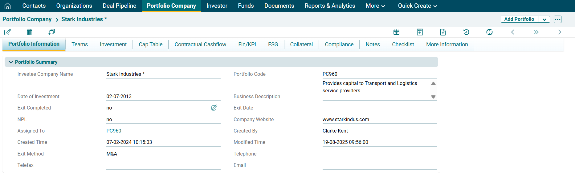 In PE Front Office, you can change the screen configuration of the Portfolio Company information. You can add, hide, or rename the fields.