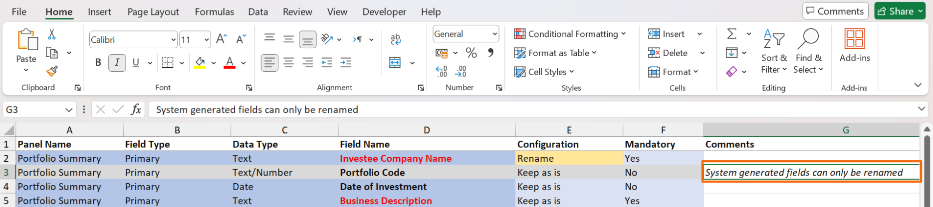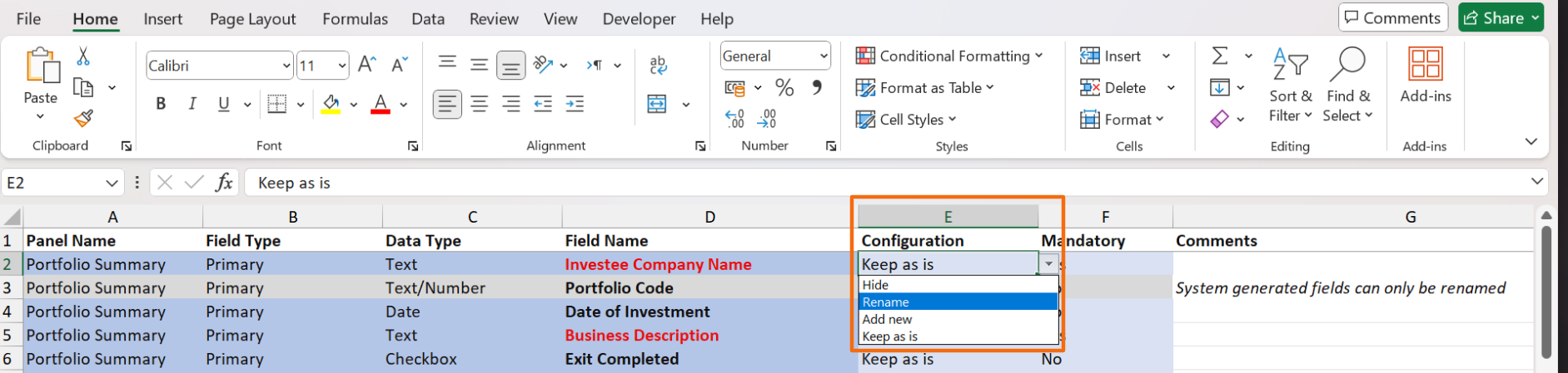 3. In the downloaded file, choose the desired option, i.e. Hide, Rename, Add New, or Keep as is from the dropdown list in column E. System generated fields can only be renamed.