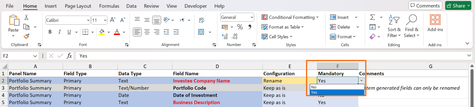 4. To make a field mandatory, go to column F. To mark it as mandatory, choose Yes from the dropdown list in column F. Else, choose No.