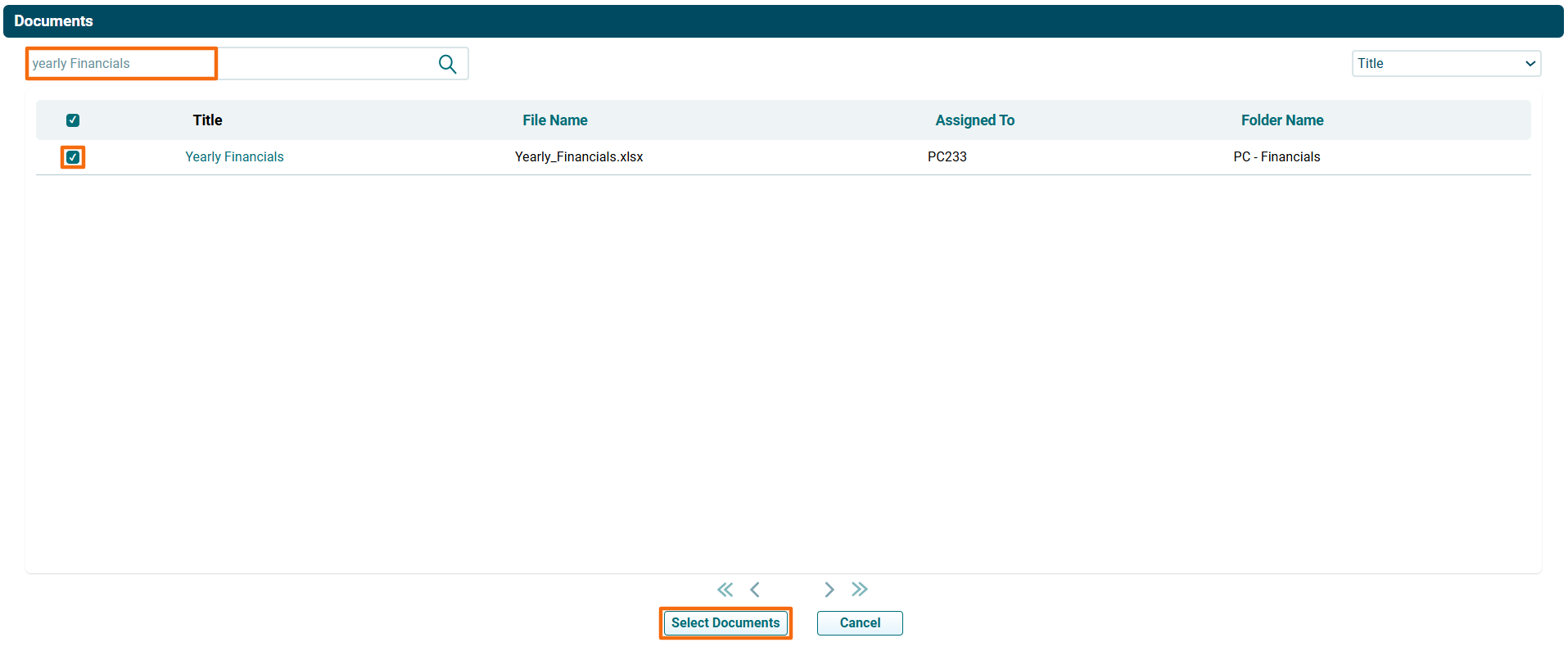 3. The Documents window is displayed. Type the file name in the search box. Check the checkbox against the file name. Click on Select Documents button.