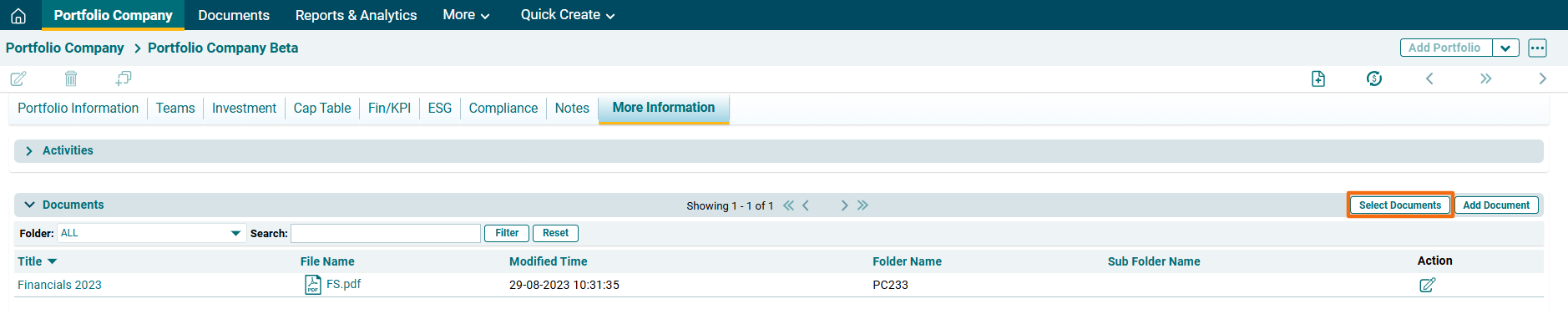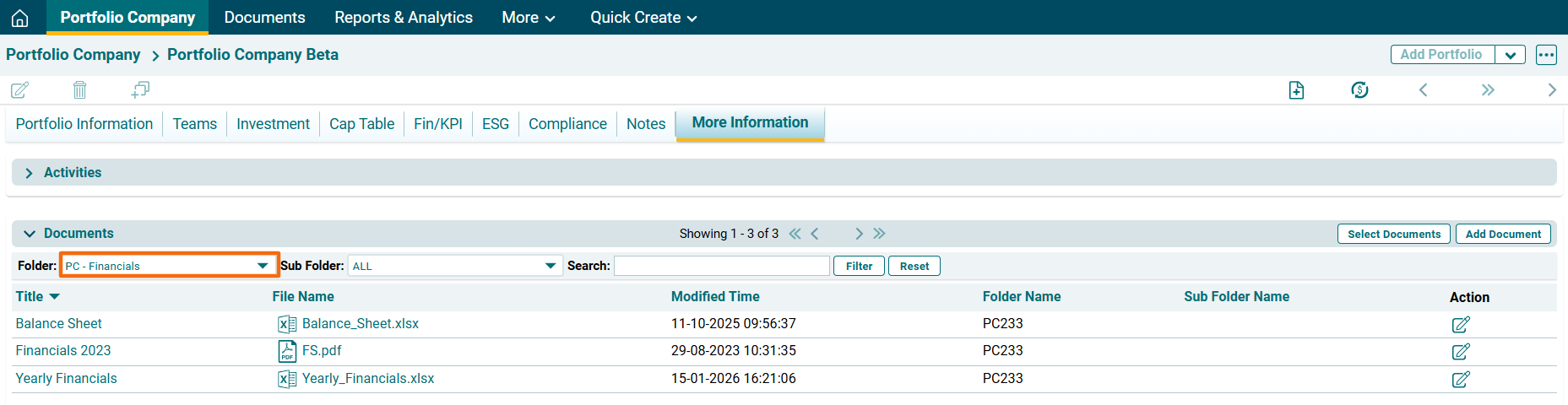 To view documents of a specific folder, you can use the filter on top left corner of the panel. You can choose a folder from PC Legal, PC Financials, PC Reports, PC Share Certificates, and PC Checklist.