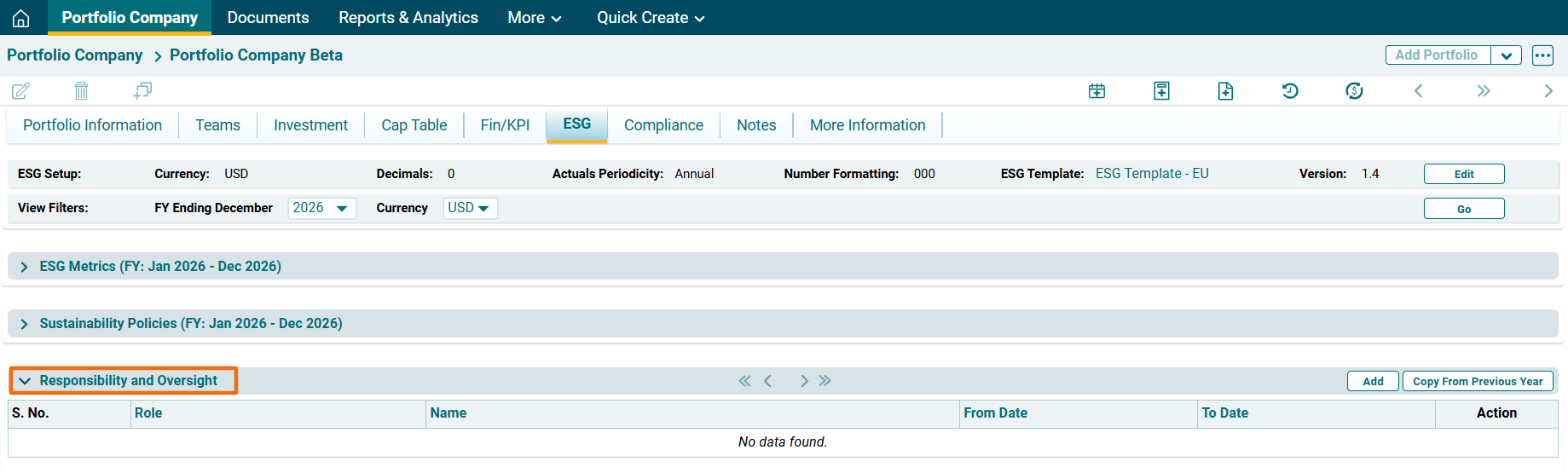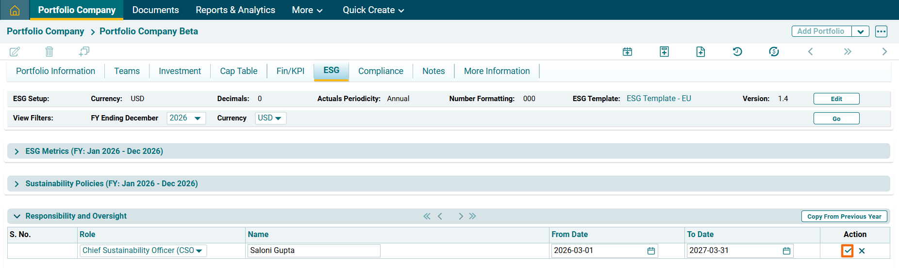 This panel allows you to assign roles and responsibilities related to ESG operations.