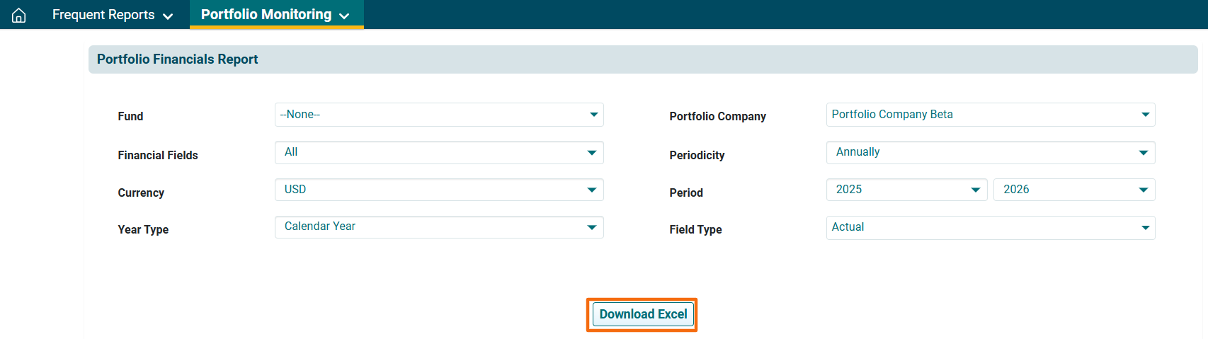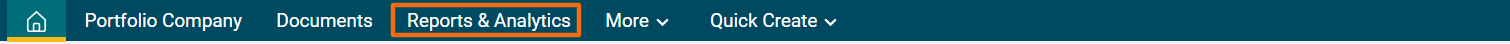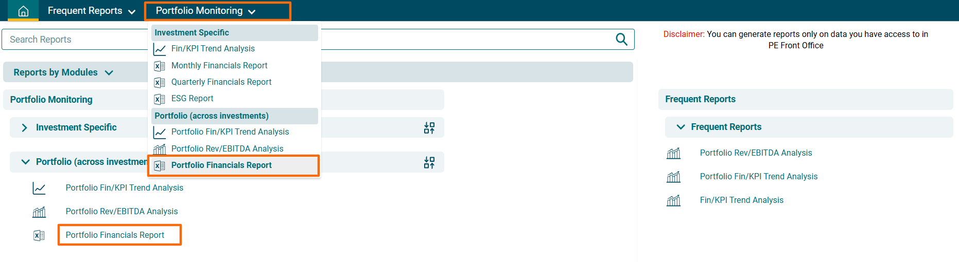 2. You can access the report from the dashboard by clicking Portfolio Financials Report in the Portfolio Monitoring panel or from the Portfolio Monitoring drop-down menu in the blue vertical bar.