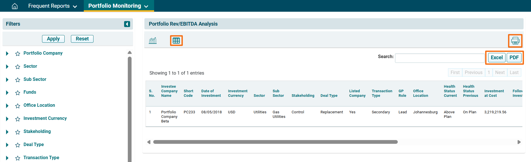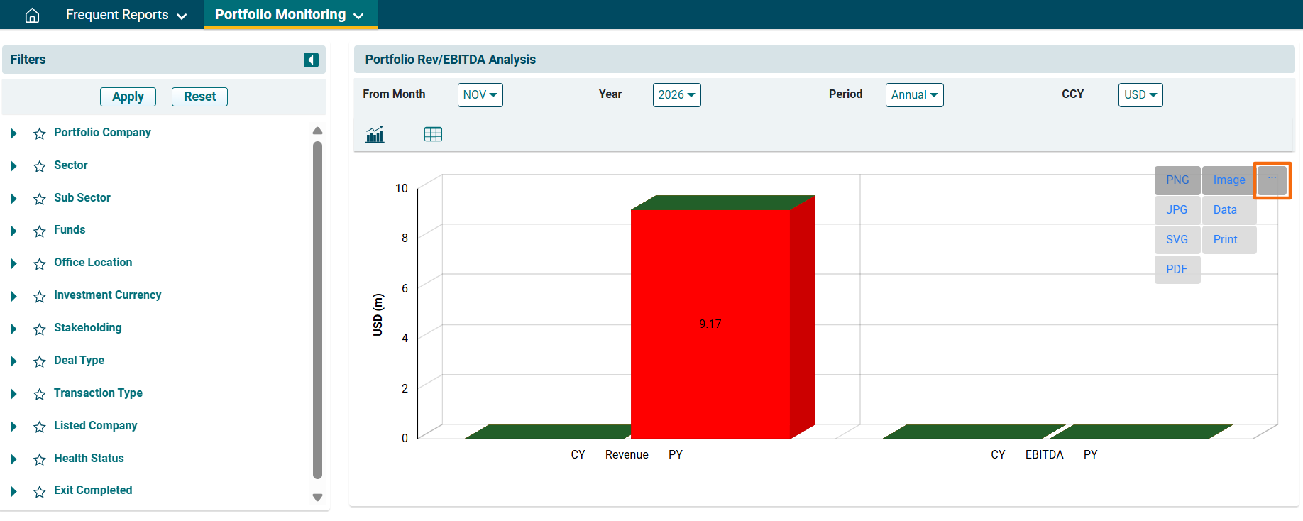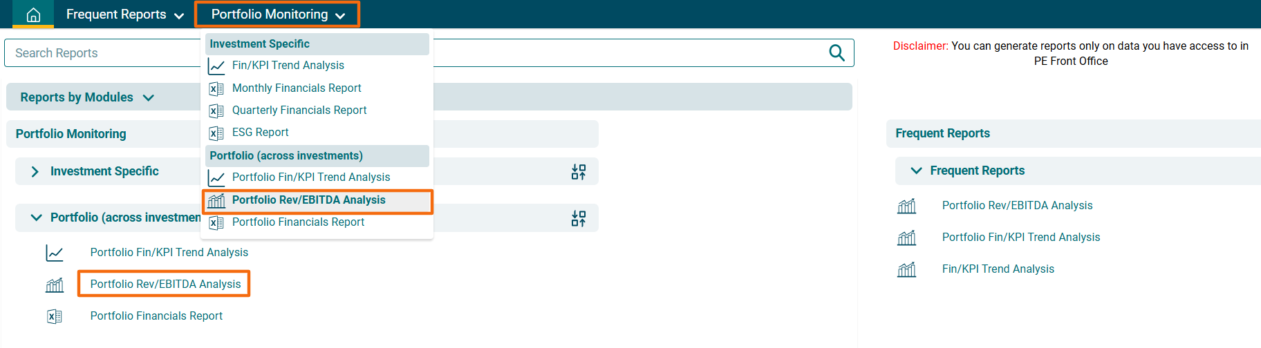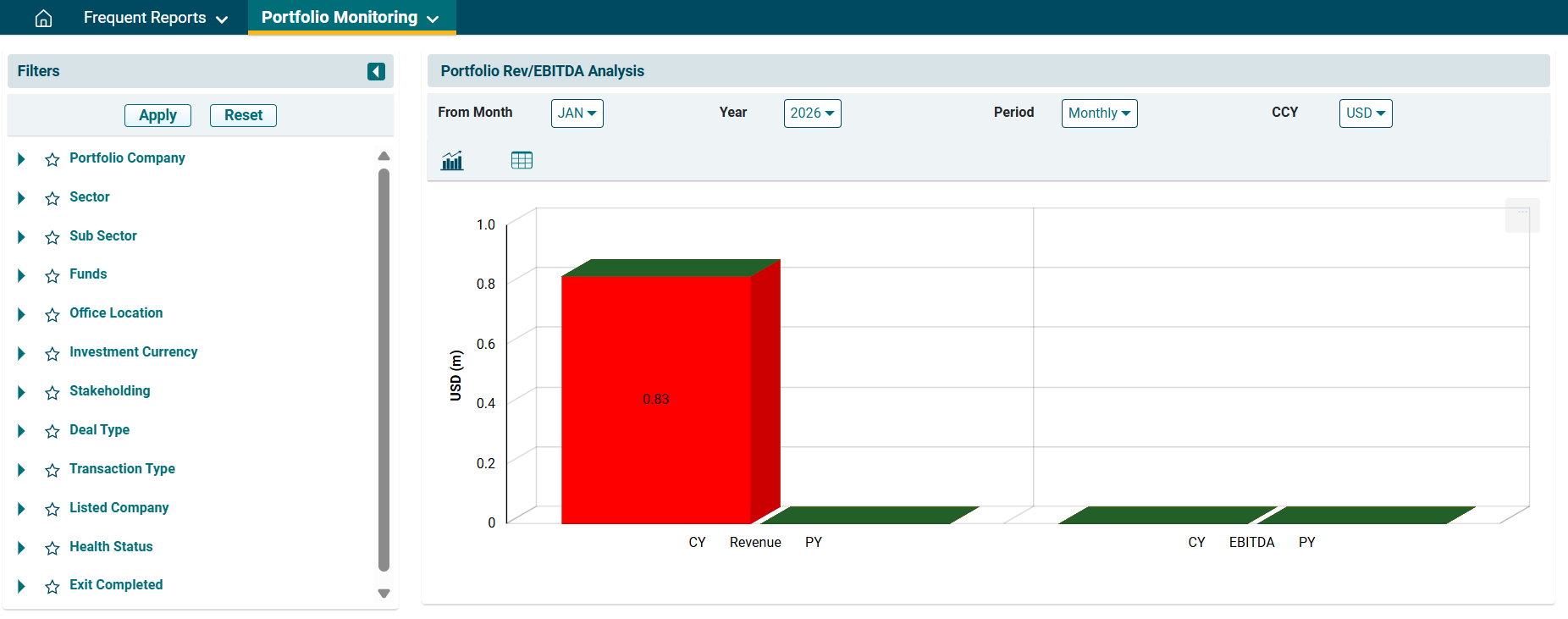 2. You can access the report from the dashboard by clicking Portfolio Rev/EBIDTA Analysis in the Portfolio Monitoring panel or from the Portfolio Monitoring drop-down menu in the blue vertical bar.