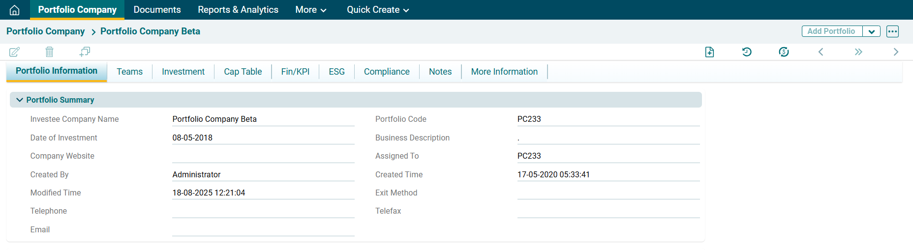 This panel captures the basic details of a Portfolio company.