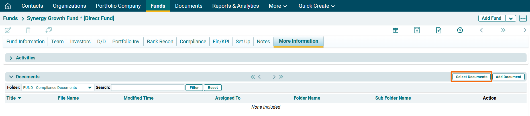 2. Click on the More Information tab. There are several panels here, including the Documents panel. Click on Select Document button in the top right corner of the panel.