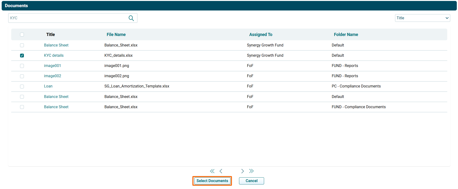 3. The Documents window is displayed. Type the file name in the search box. Check the checkbox against the file name. Click on Select Documents button.