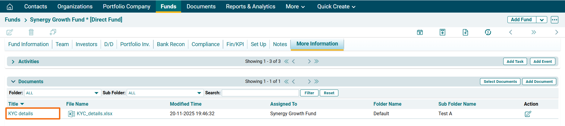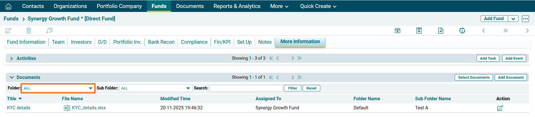 To view documents of a specific folder, you can use the filter on top left corner of the panel. You can choose a folder from Fund- Legal 5, Fund- LPA, Fund- Reports, Fund, Board Minutes, Fund- Tax Notice, Fund- MeIT Approval Letter, Fund- TSTF, Fund- DD Notice, Fund- Tax, Fund- Legal, Fund- PPM, Due Diligence, and Fund- Communiqué.