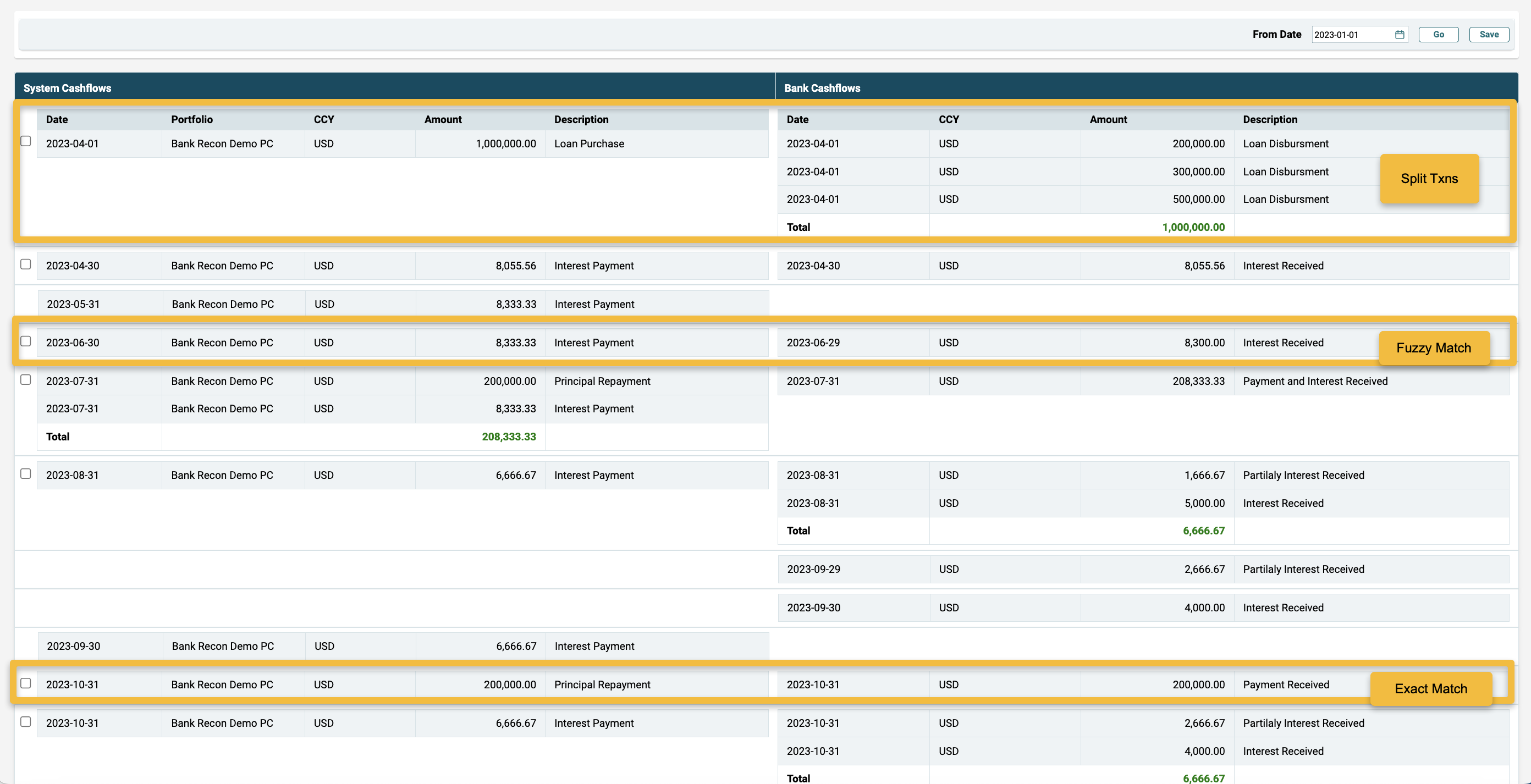5. System will fetch both the bank cashflows and unpaid expected PC cashflows and try and match them automatically using the 3 levels of logic: