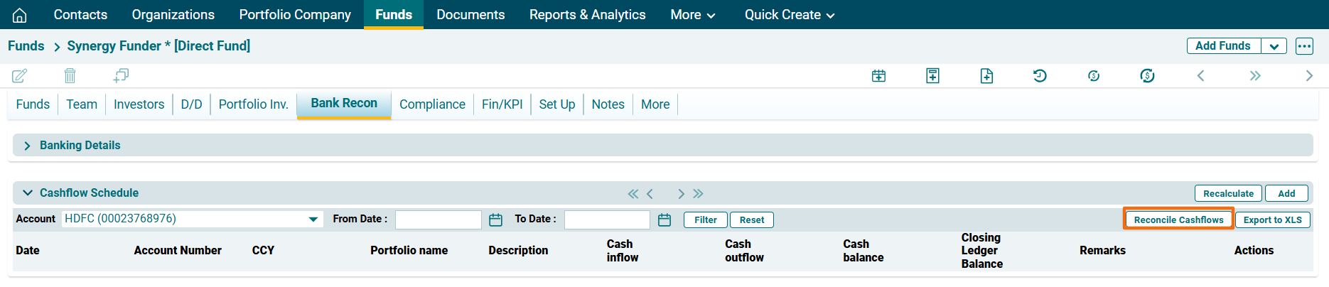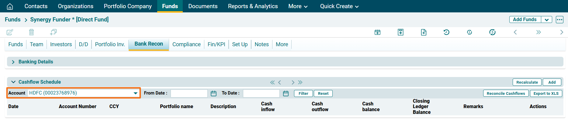 1. Navigate to Cashflow Schedule panel in the Bank Recon tab. Select a bank to see the cashflows.
