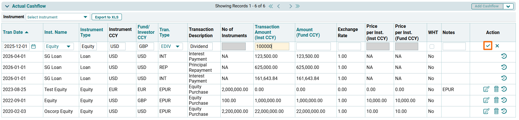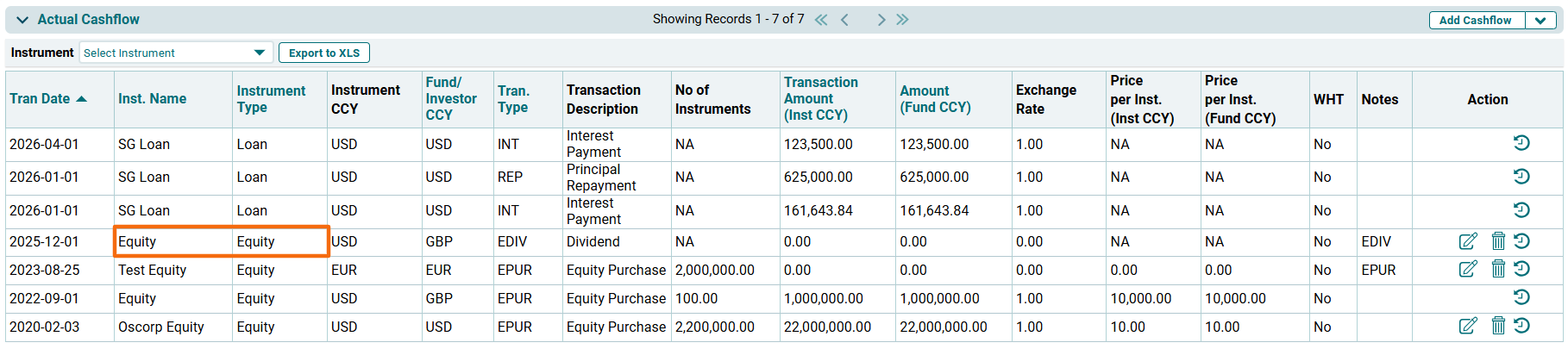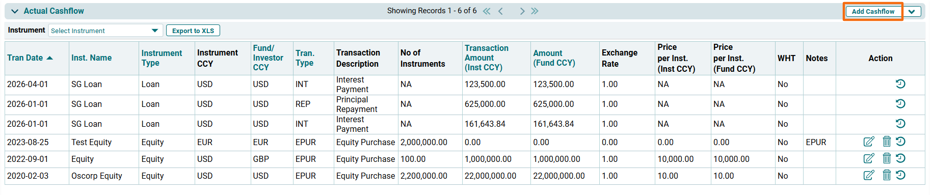 In the Actual Cashflow tab, you can add and manage actual cashflows for all the instruments.